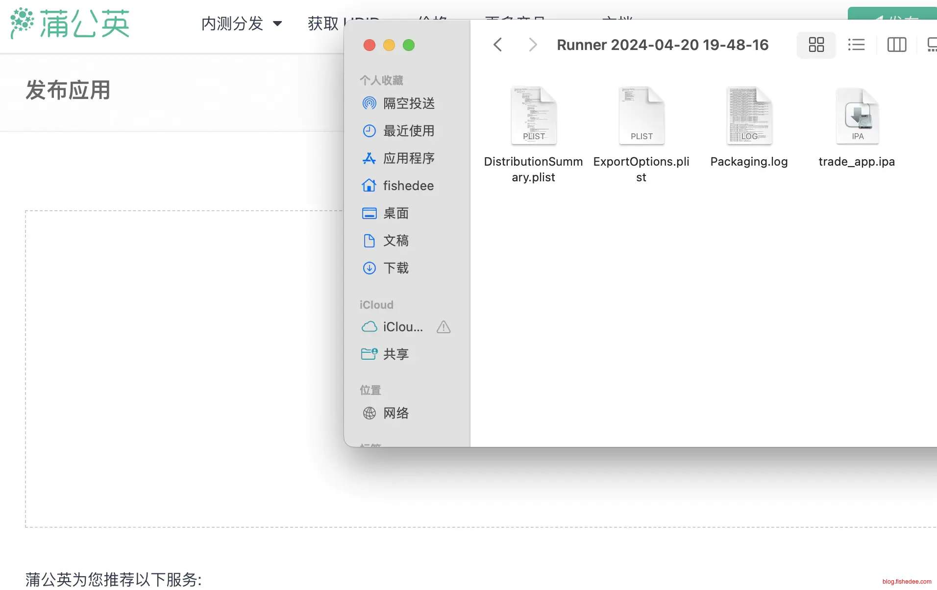 在Export文件中找到ipa文件,然后丢入蒲公英里面就可以发布内测了。