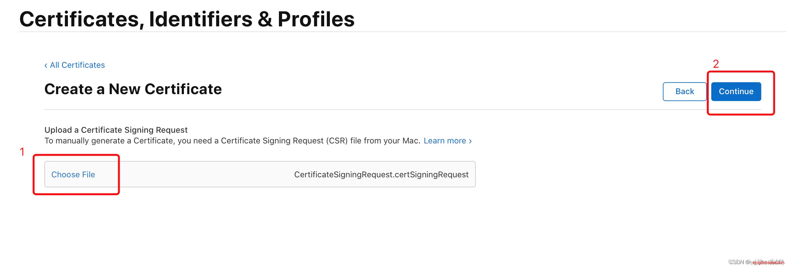 接下来需要用到刚刚生成的证书请求文件,点击“Choose File…”选择刚刚保存到本地的 “CertificateSigningRequest.certSigningRequest”文件,点击 “Continue” 生成证书文件