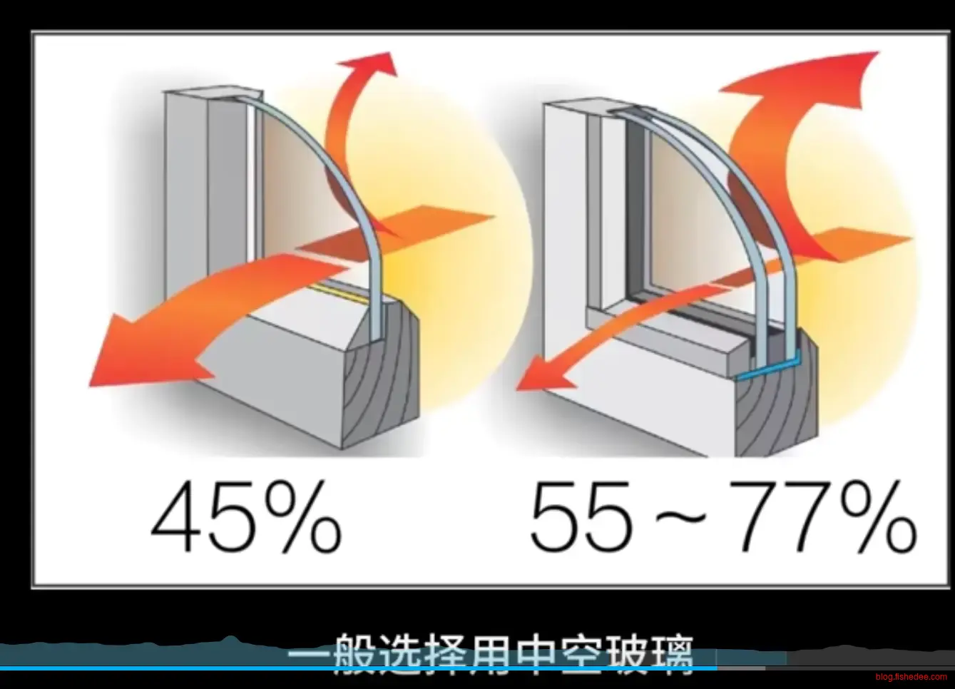 - 热传导,通过窗框窗扇传导能量,尽量使用导热系数低的材料