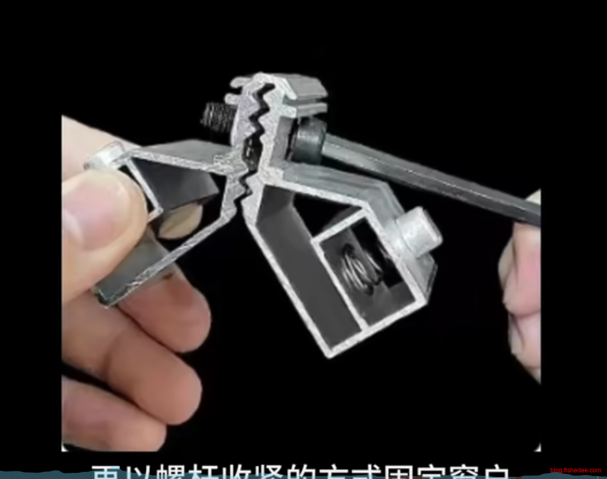 活动角码,通过弹簧卡扣与铝材连接,再以螺杆收紧的方式固定窗户。优势在于方便安装,易于拼框。缺点在于,其连接不够紧密,密封性能一般。进水容易使弹簧生锈,失去弹性或者断裂。