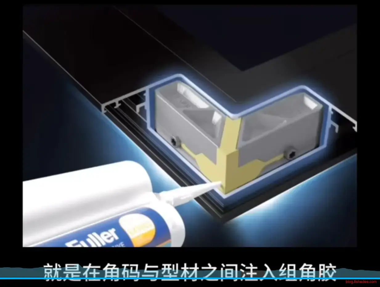 撞角工艺,就是在铝合金型材拼接处,表面先抹上组合胶,再将角码塞入45度型材中,最后通过精密的机器撞击挤压,连接一体成型。该拼接工艺的好处在于其无缝连接,不易进水开裂。缺点在于只能在生产车间进行,不支持现场组框。