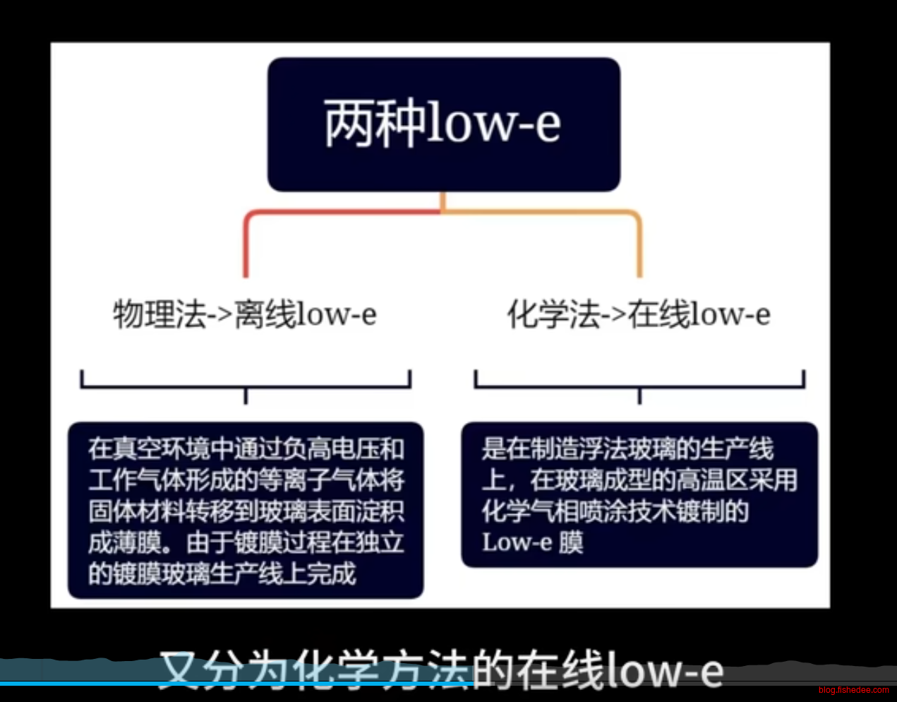 - 化学在线法,在制造玻璃时喷涂以锡盐为主要成分的化学溶液。形成单层具有低辐射作用的氧化锡化合物薄膜。该膜比较坚固,能够进一步避免玻璃划伤,这种方法也称为硬膜。硬膜low-e膜长期暴露空气也没有氧化变性的问题,所以允许单独作为单片使用。