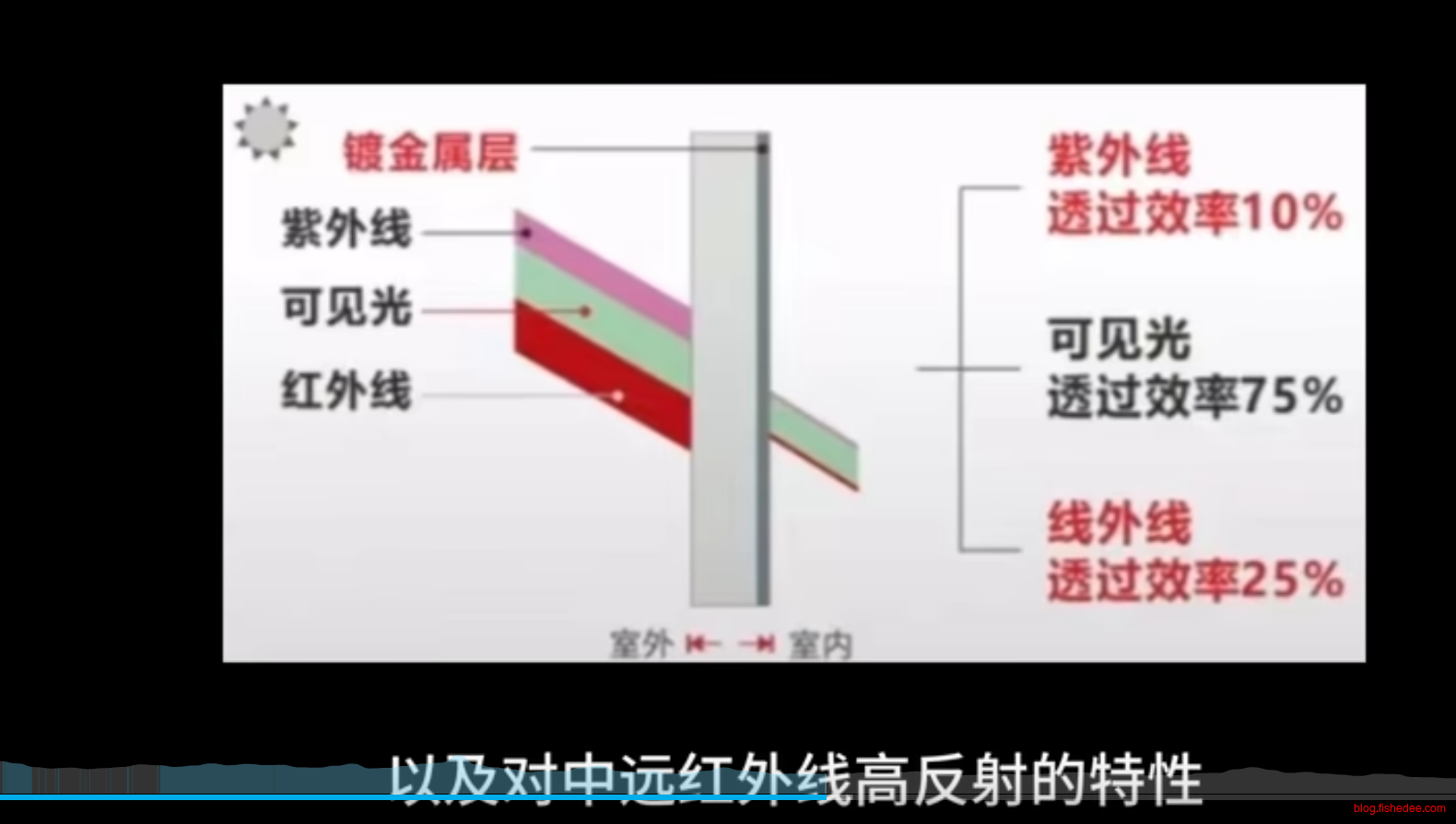 - lowe-e玻璃,就是对玻璃镀膜,可以反射紫外线和红外线,仅让可见光透过。透光率最大只有70%左右。
